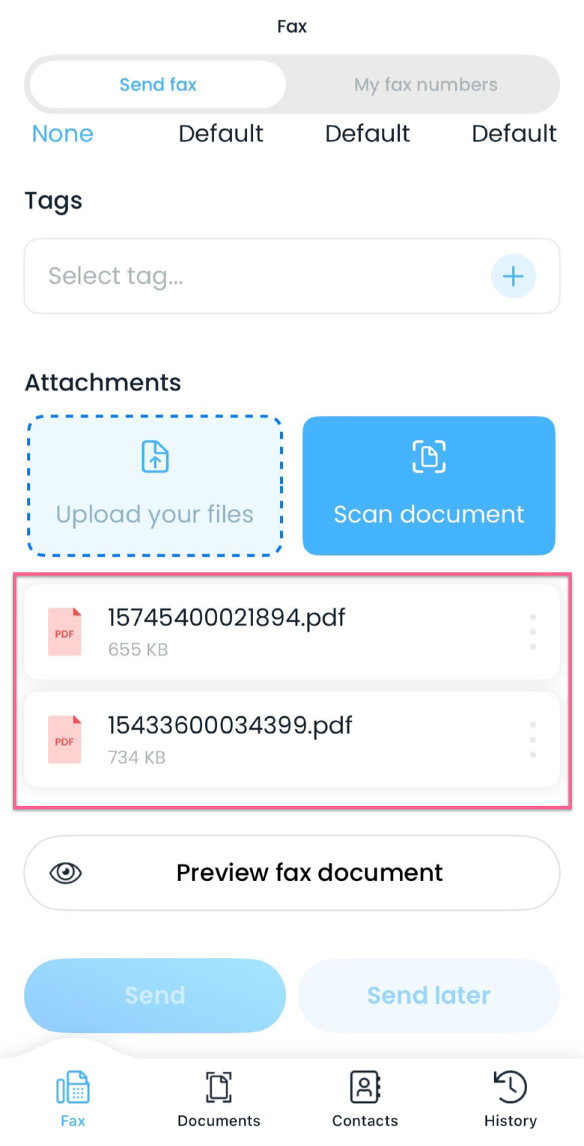 Once you click 'done' and then 'save', your attachment will populate on the send fax page: