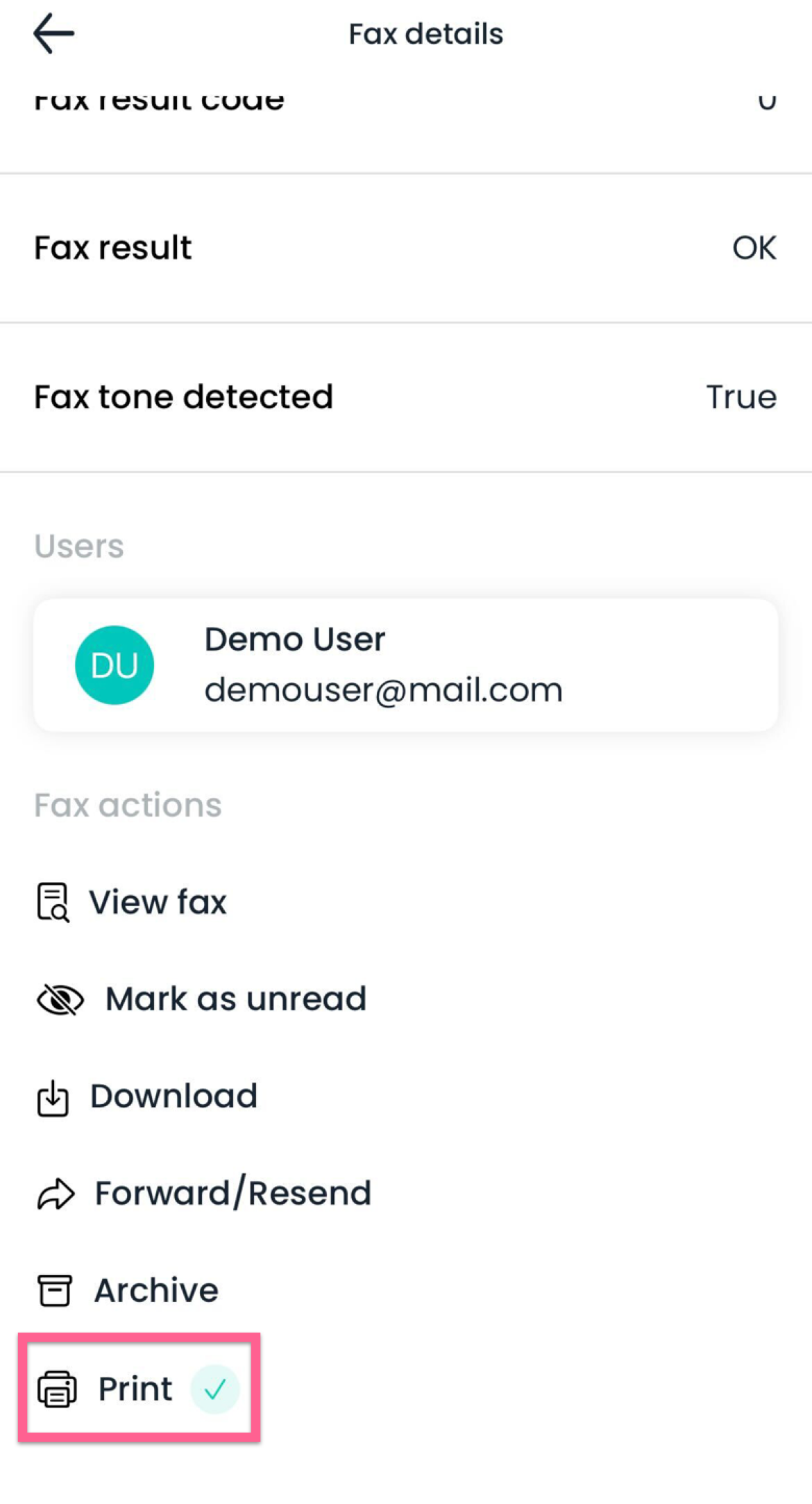 To manually print a fax, click the 3 dots next to the fax, then click 'Show full information'. Scroll down, then click 'Print':