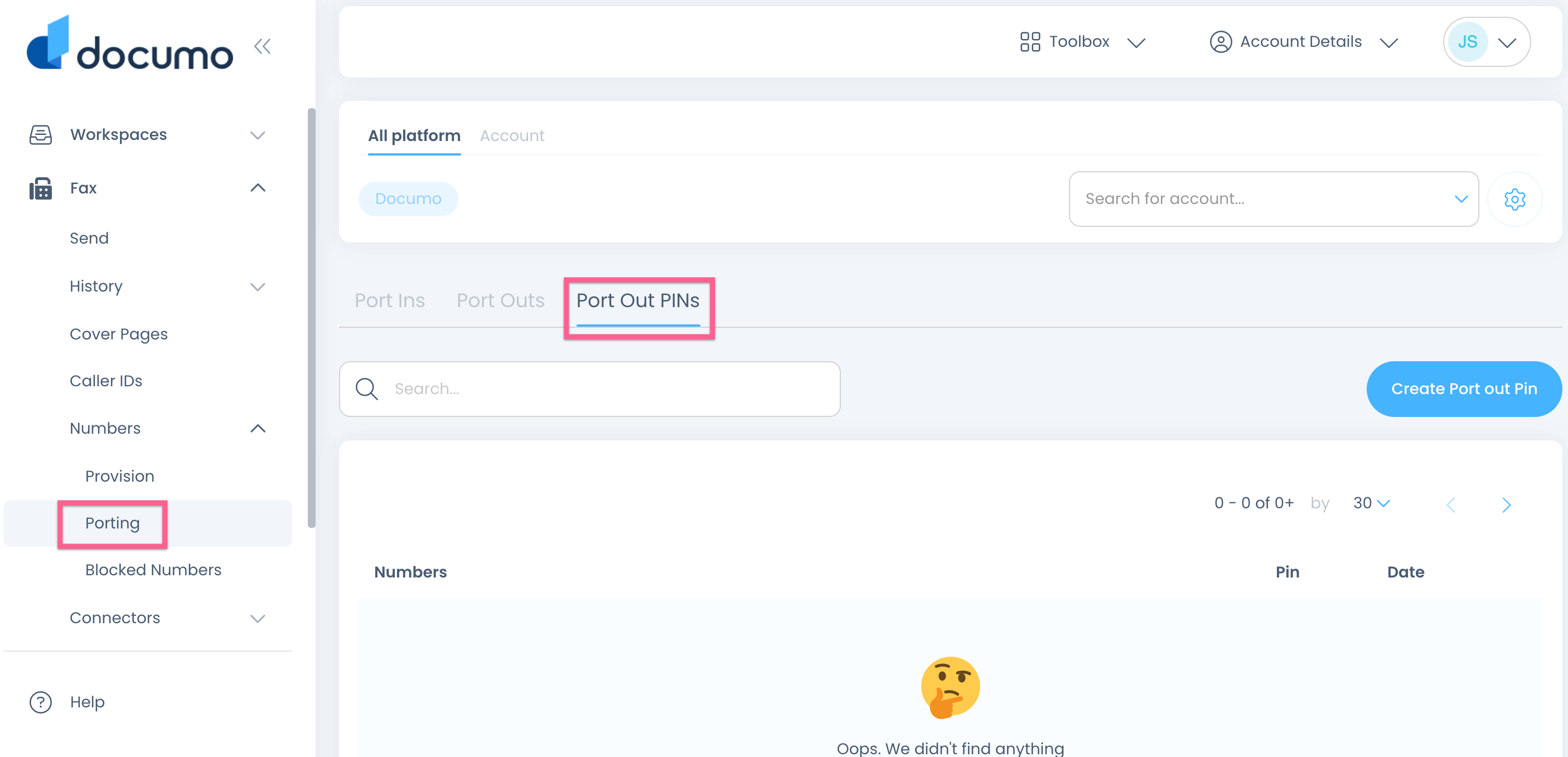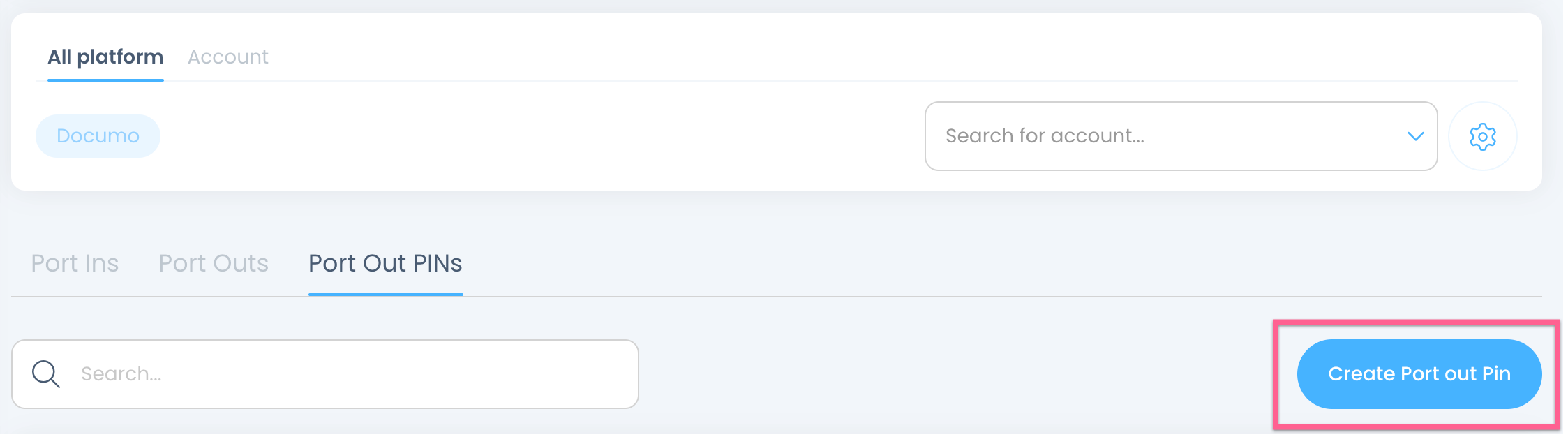 To begin, navigate to the Numbers page, then click Porting, and the Port Out PINs tab: