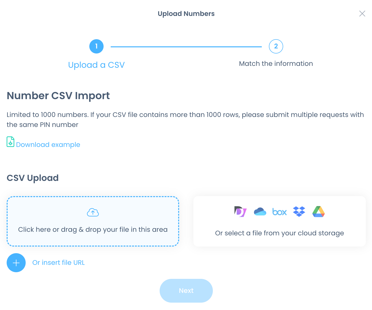 You can also upload a CSV with up to 1000 numbers and PINs.