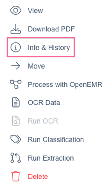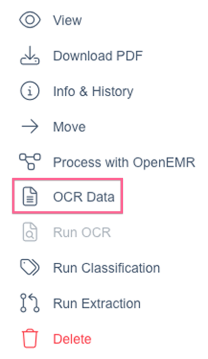If OCR has already been ran, OCR Data will be provided next to the document for easy copying of the text by clicking OCR Data: