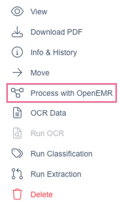 If classification and extraction have already been ran, processing the document populates the document type and the data fields in the document processor. Document type and data fields can be added manually if classification and extraction have not been ran. Click Process with your EHR (choose the EHR your account is integrated with):