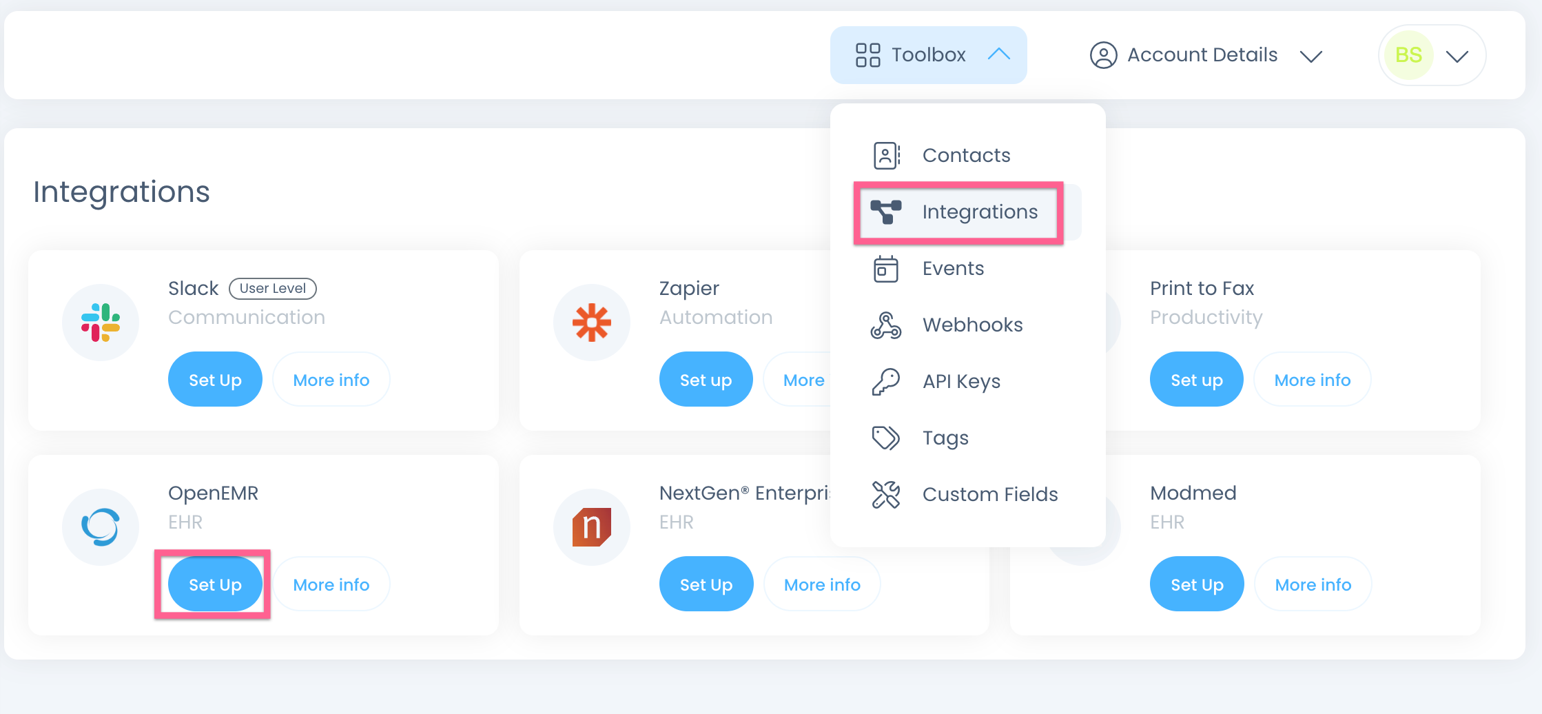 First, navigate to the Integrations page, then click Set Up on the OpenEMR integration:
