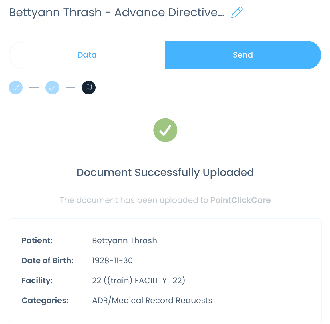 This article walks you through processing your documents and sending them to your PointClickCare instance. Before you begin, make sure PointClickCare is integrated with your account.