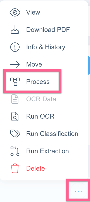 Once the integration is set up, navigate to a workspace. Click the 3 dots next to the document you would like to process, then click Process: