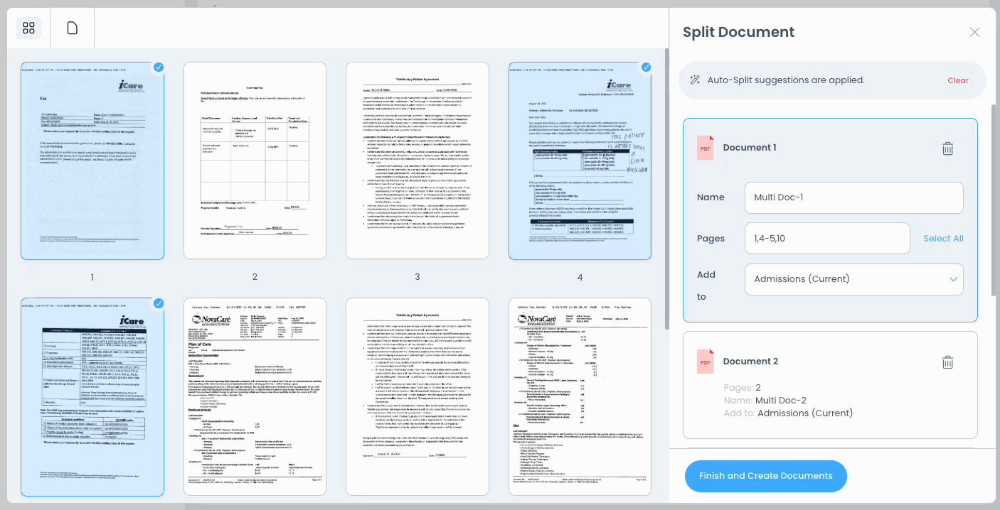 Auto-Split uses intelligent analysis of document type, patient identifiers, formatting, and overall structure to automatically detect where one document ends and another begins. Auto-Split can automatically determine which pages belong together and which should be processed separately.