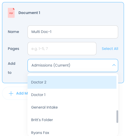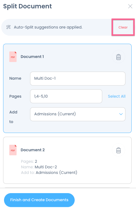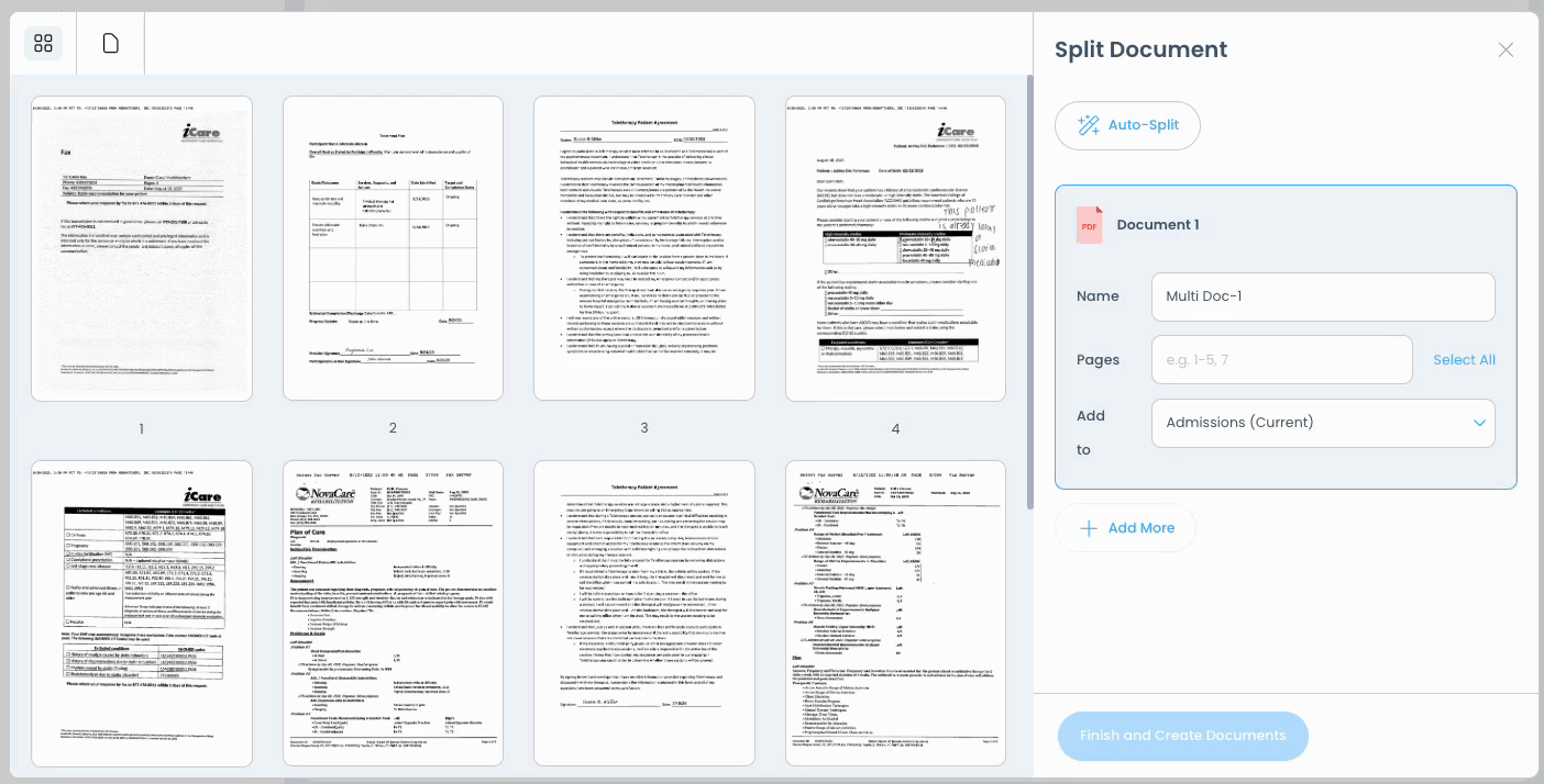 To manually split documents, select the pages you would like included in each document set. click Add More to create additional sets and assign pages accordingly: