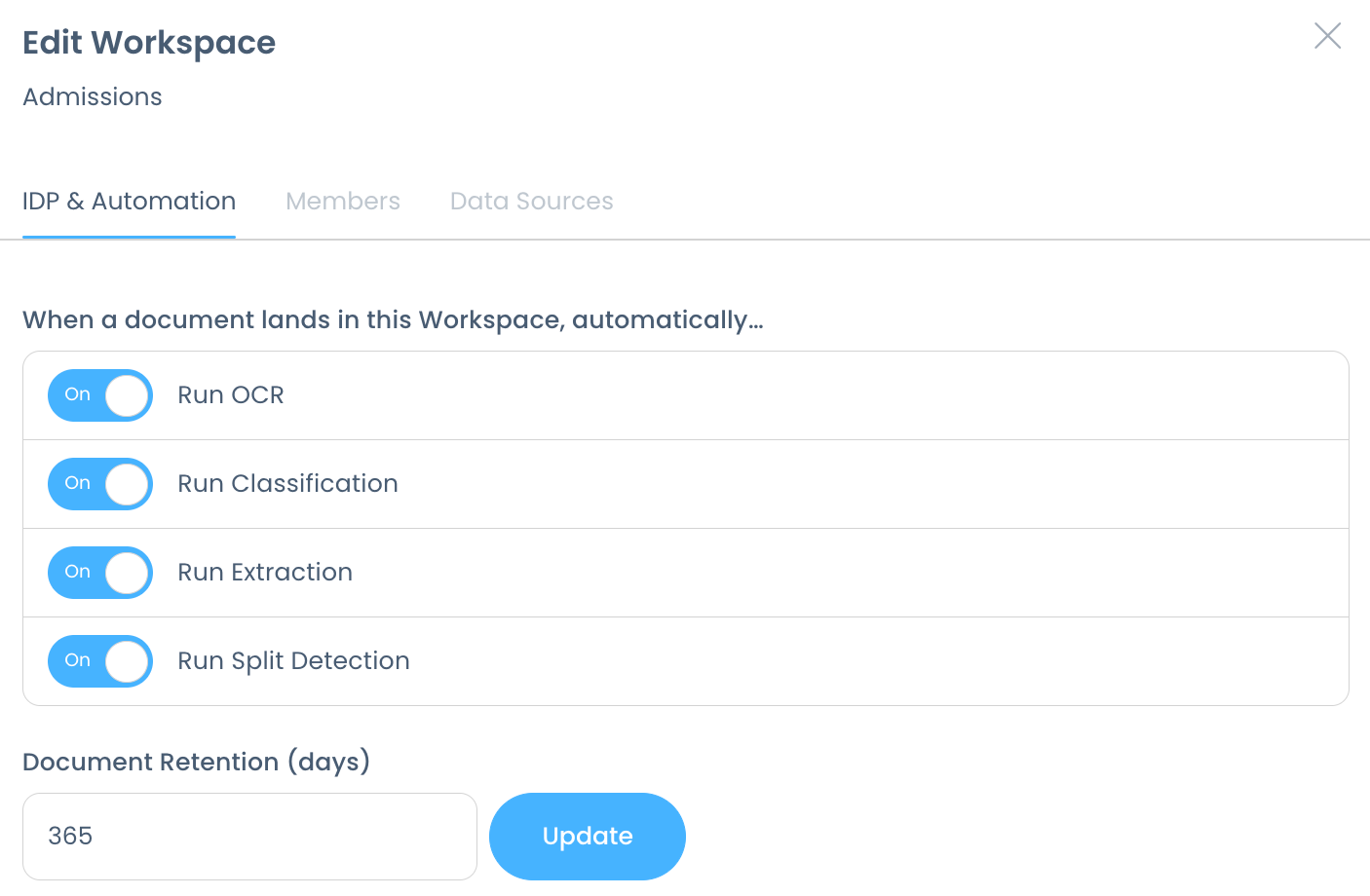 Automatically have split detection run on all documents entering a workspace by enabling the Run Split Detection toggle on the workspace: