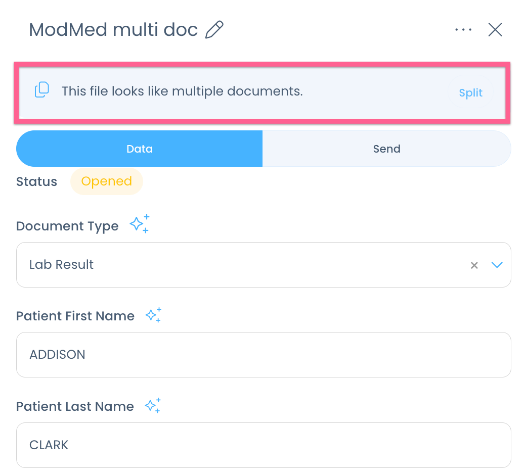 Next, to auto split a document, click the kebab menu, then click Split: