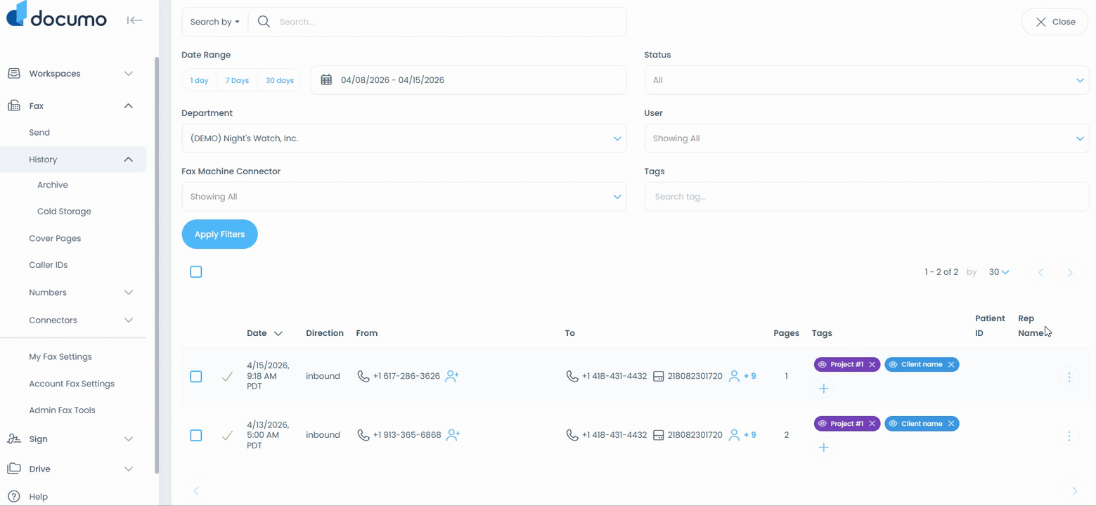 Owner or Admin users on the account have the ability to filter on the account level to view and retrieve these faxes that were not routed to a user's history.