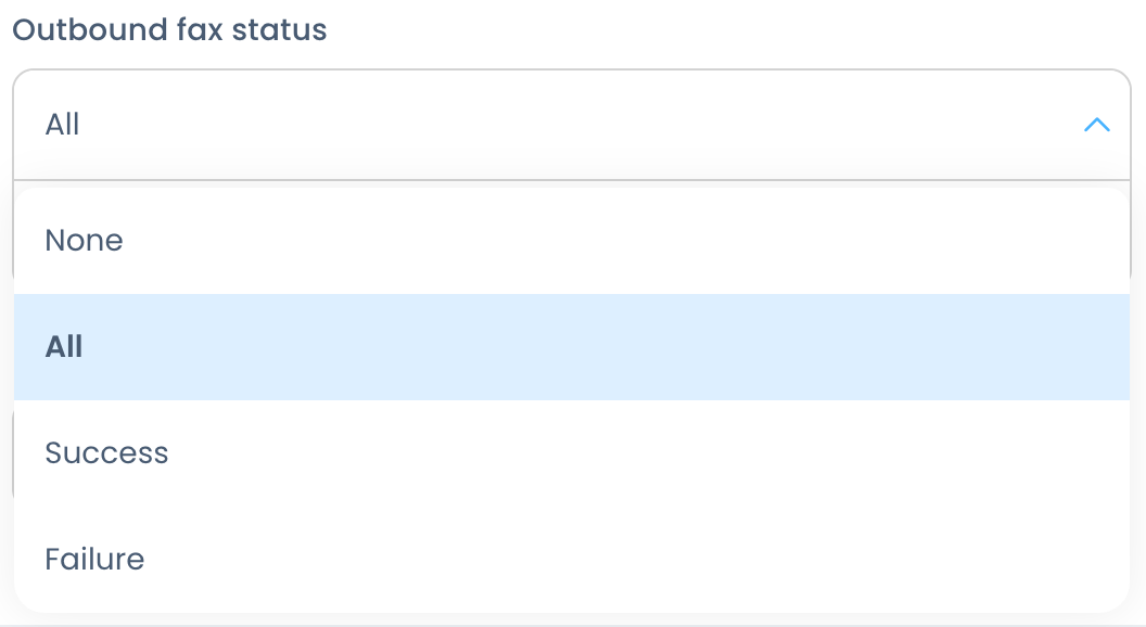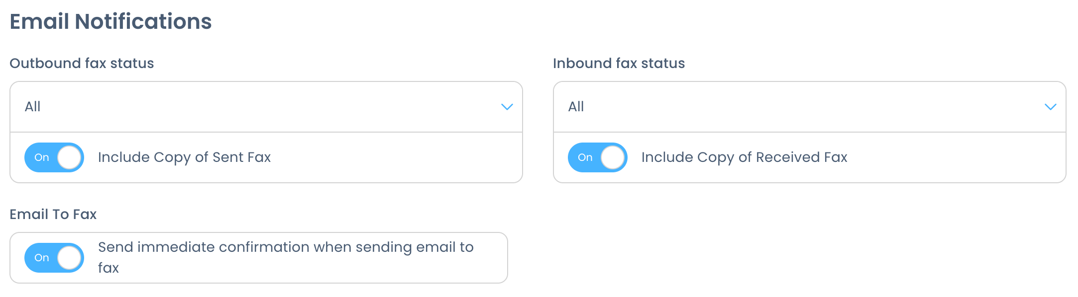 You can set email notifications for inbound and outbound fax status from All to None, Success, and Failure. Choose if you would like to include a copy of the fax in the notification.