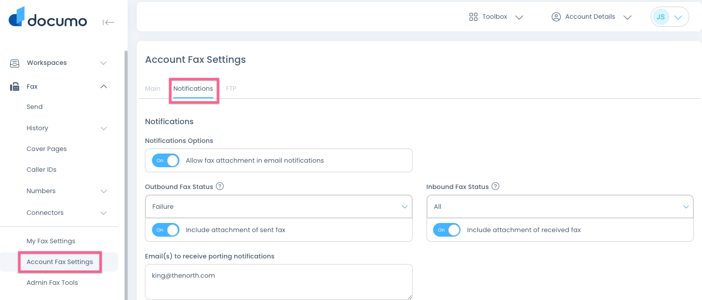 First, navigate to Account Fax Settings, then click the Notifications tab: