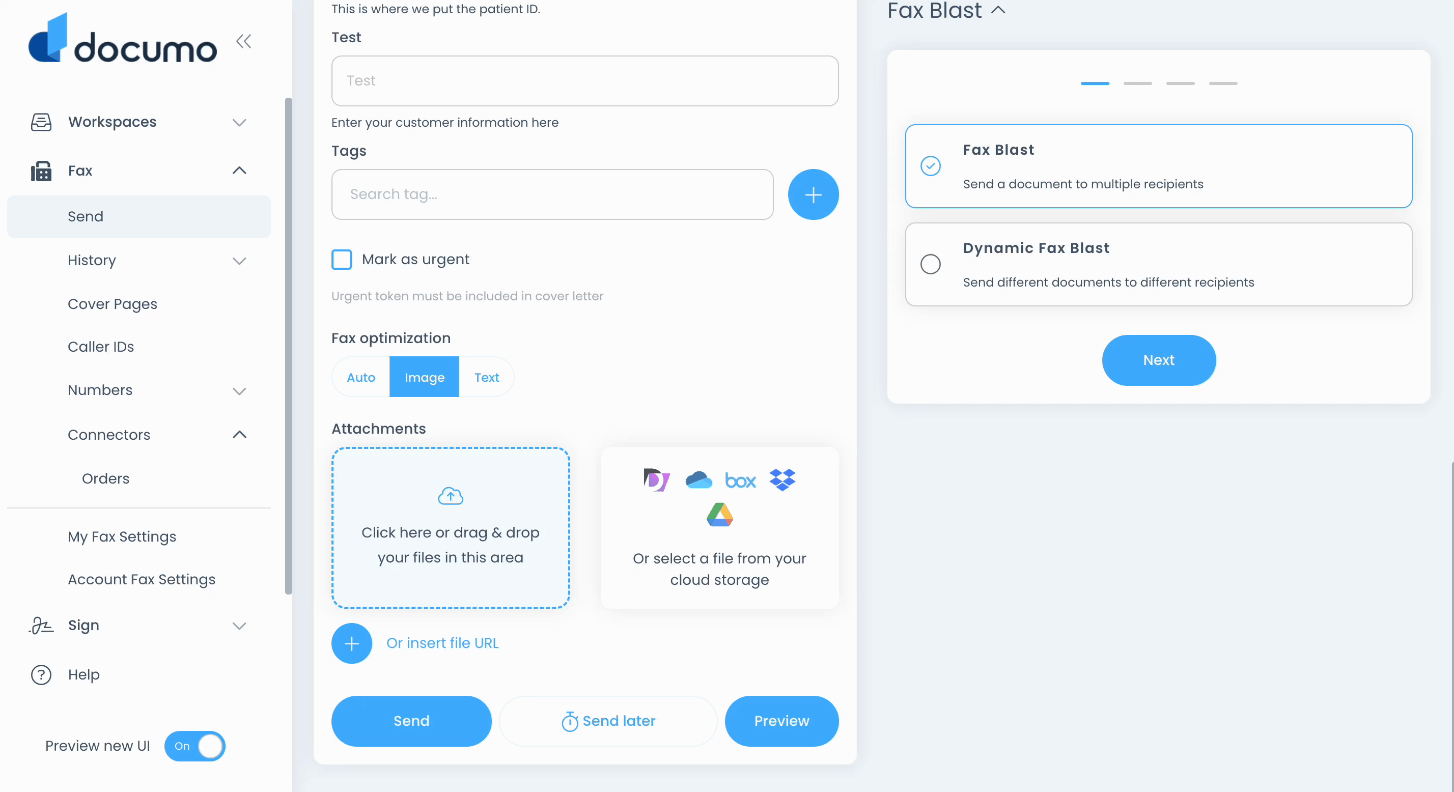 Users can schedule a fax to send at a future time directly through the web portal utilizing the Send Later feature.