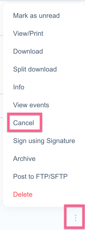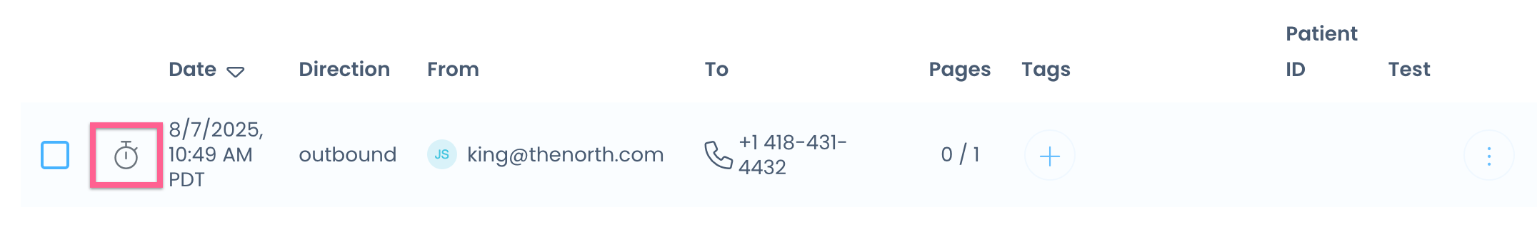 The fax will show a watch icon on your history and can be cancelled any time prior to the fax processing. To cancel the fax, check the box to the left of the fax and click Cancel in the menu: