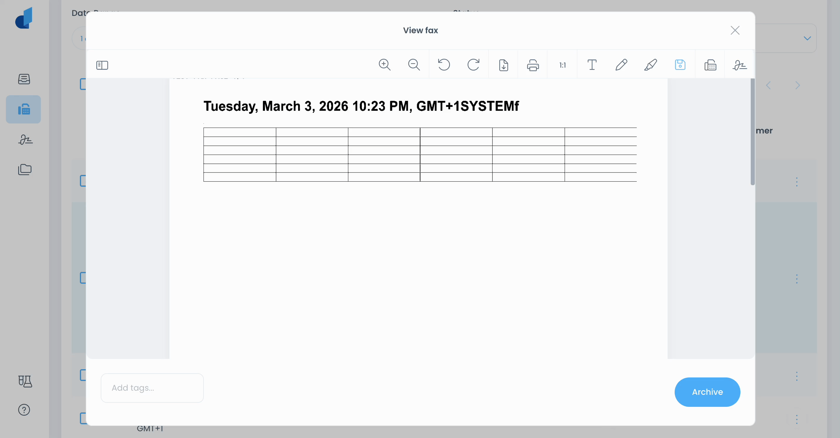 To annotate a fax, view the fax by clicking directly on the fax, or clicking View/Print in the kebab menu. Select the annotation tool you would like to use, then mark up the page. Once finished, click the Save icon:
