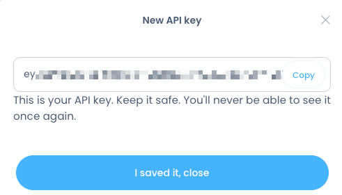 Make sure to either have the API key emailed to you or copy and save it somewhere secure. You won’t be able to view it again after it’s created: