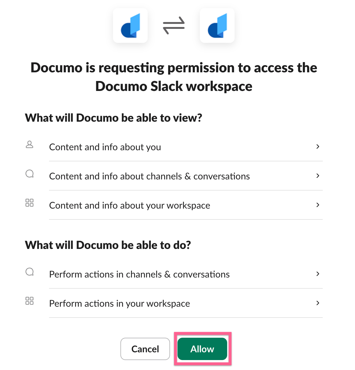 NOTE: Other users in your Slack instance will see the Documo integration, however they will only be able to use it if they are a user in Documo and connect the integration.