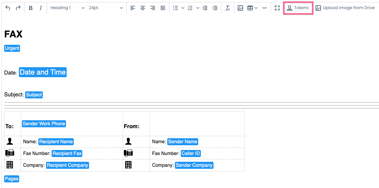 Urgent: When the 'mark as urgent' box on the send fax page is selected and the 'urgent' token is added to a cover page, this will add the word Urgent to your cover page: