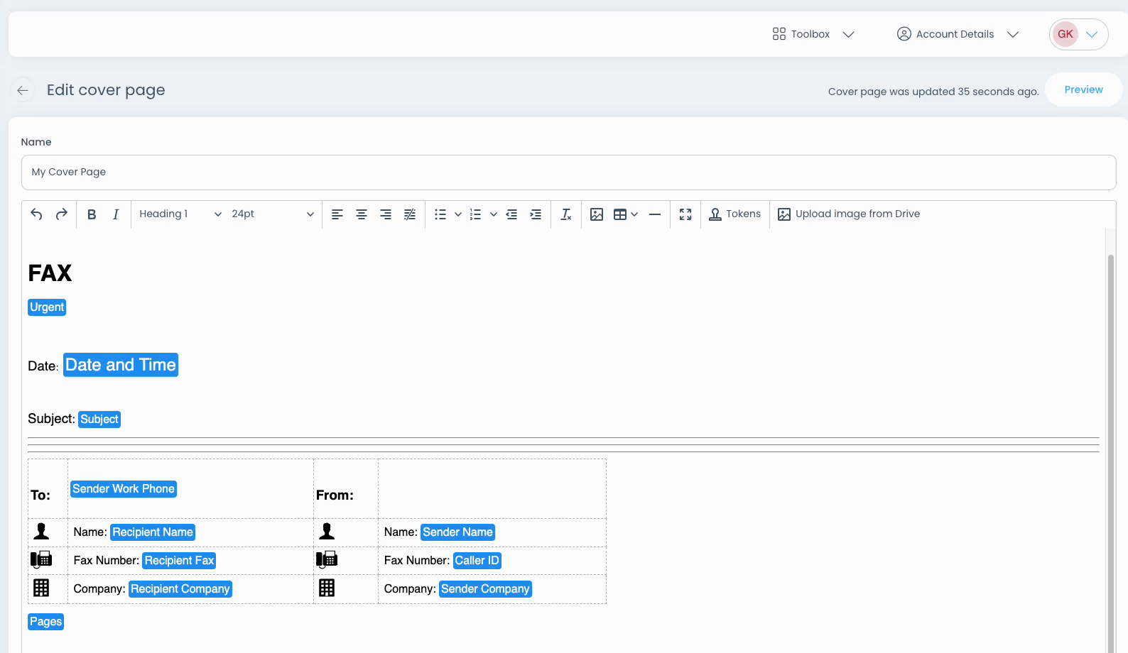 System: Documo provided cover pages that can be used as is or can be duplicated and edited. These can be disabled by an admin or owner on the account: