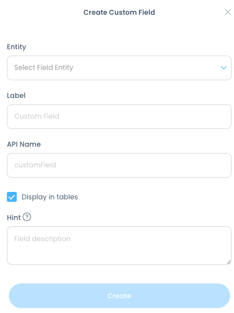 Next, fill out the fields. If you want the custom field to be displayed in your history and on reports, keep the box Display in tables checked: