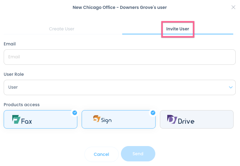 A user can be invited by adding their email address, selecting their user role, and adding their product access. From here, they'll receive an email to set up their user under your account.