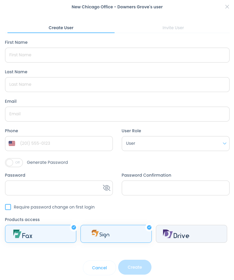 Enter the new users information into the fields, choose the user role, choose the product access they should have, then click Create:
