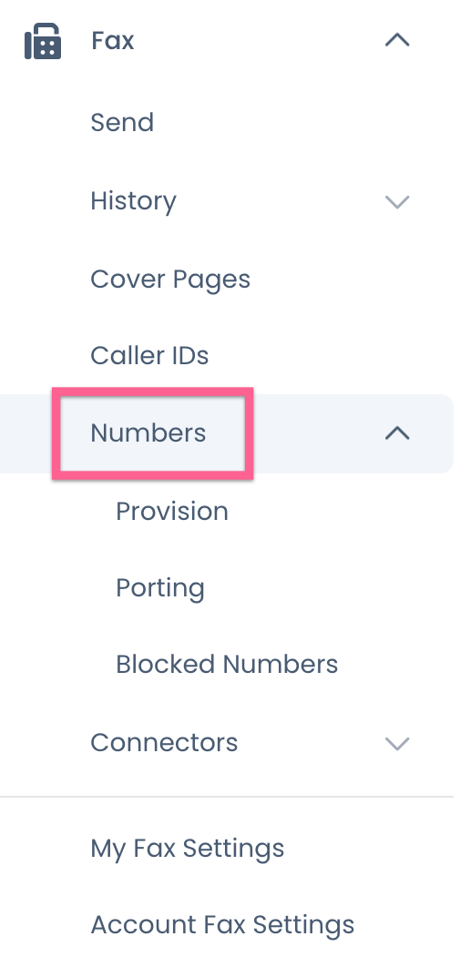 First, click the Fax menu, then click Numbers: