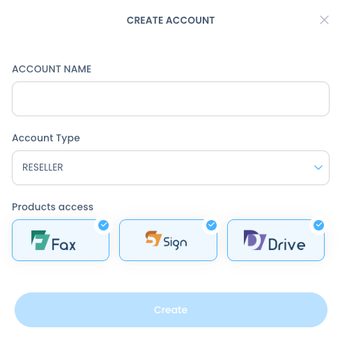 Enter the Subaccount name and account type, choose the product access, then click Create: