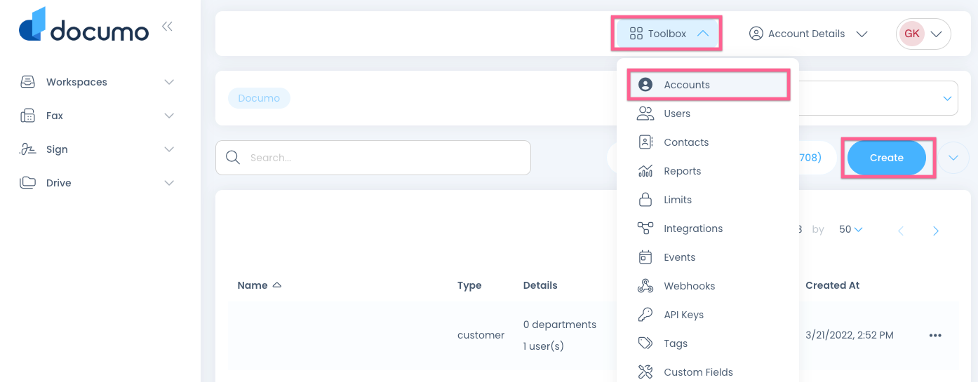 Navigate to the Accounts page in the Toolbox menu, then click Create: