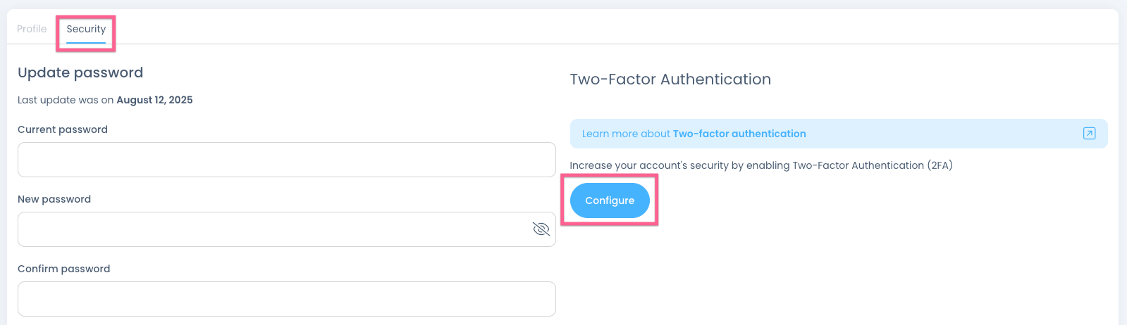 Click the Security tab, then click Configure under Two-Factor Authentication: